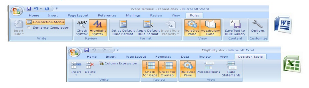 Rule Solutions for Office enables you to edit business rules in Microsoft Office documents called RuleDocs. You can update and share rules with RuleDocs, which can also provide supporting documentation and information such as the original policies for the rules. Rule Solutions works in conjunction with Decision Center, which serves as a workspace for business users to collaborate on authoring, editing, organizing, and searching for business rules.
